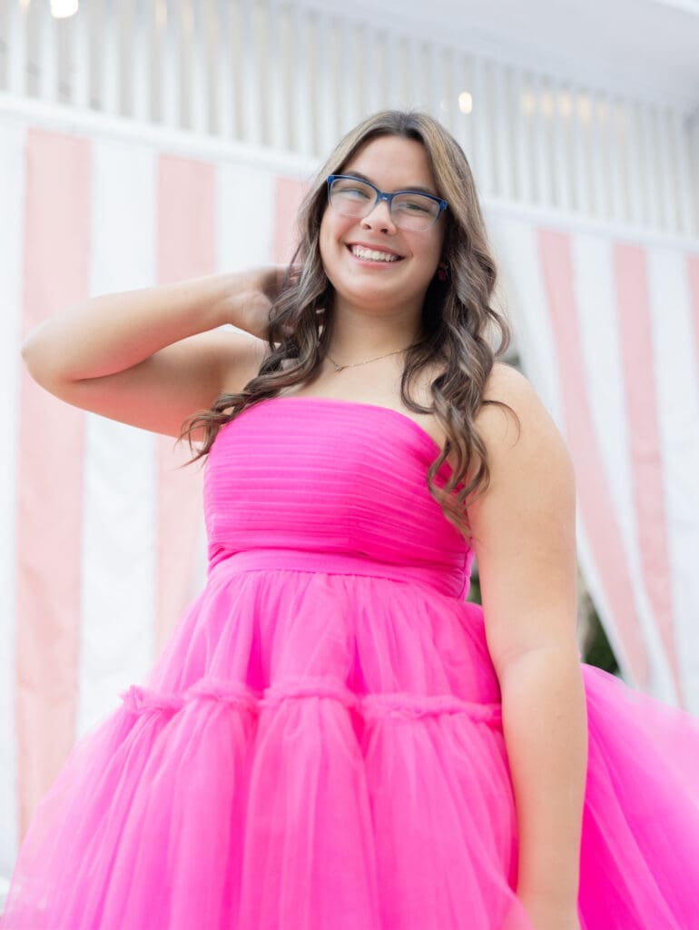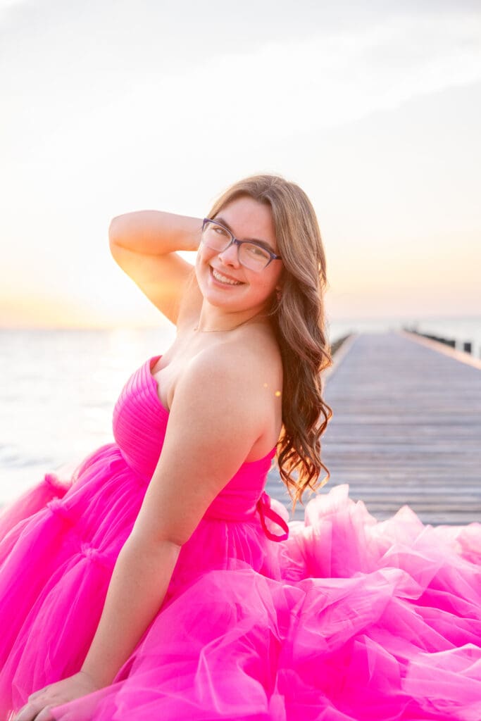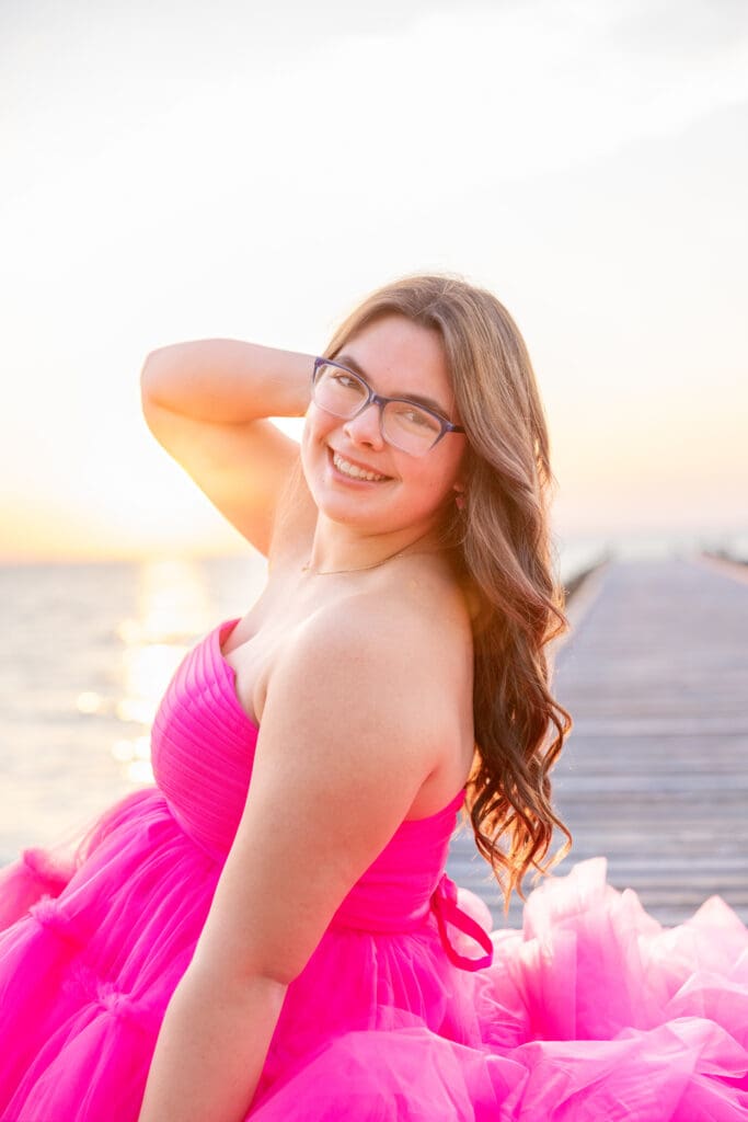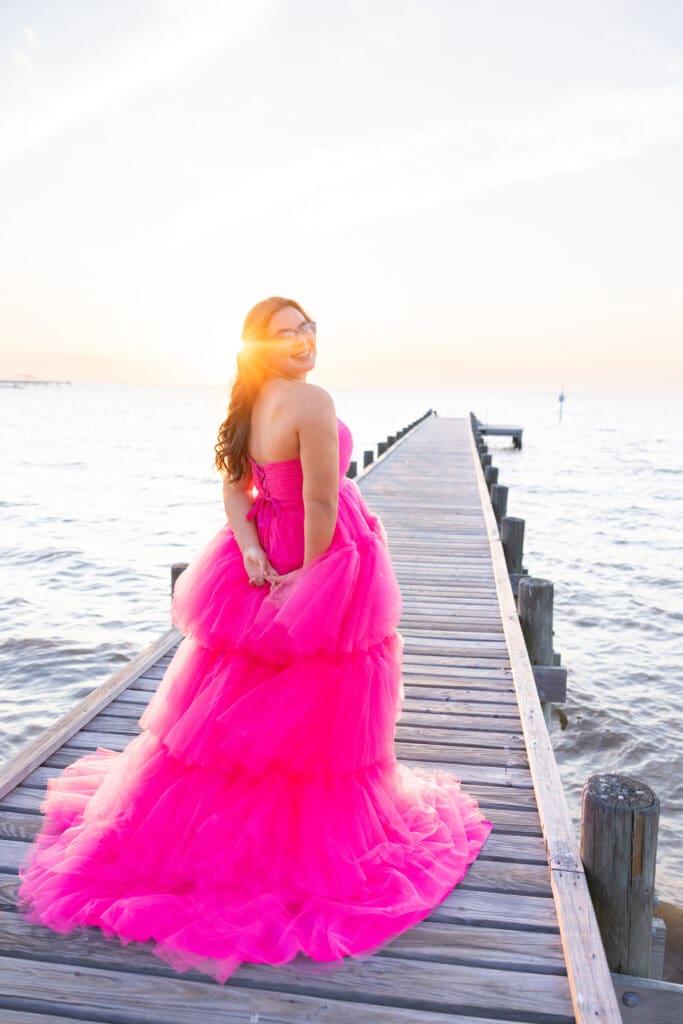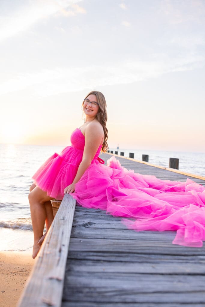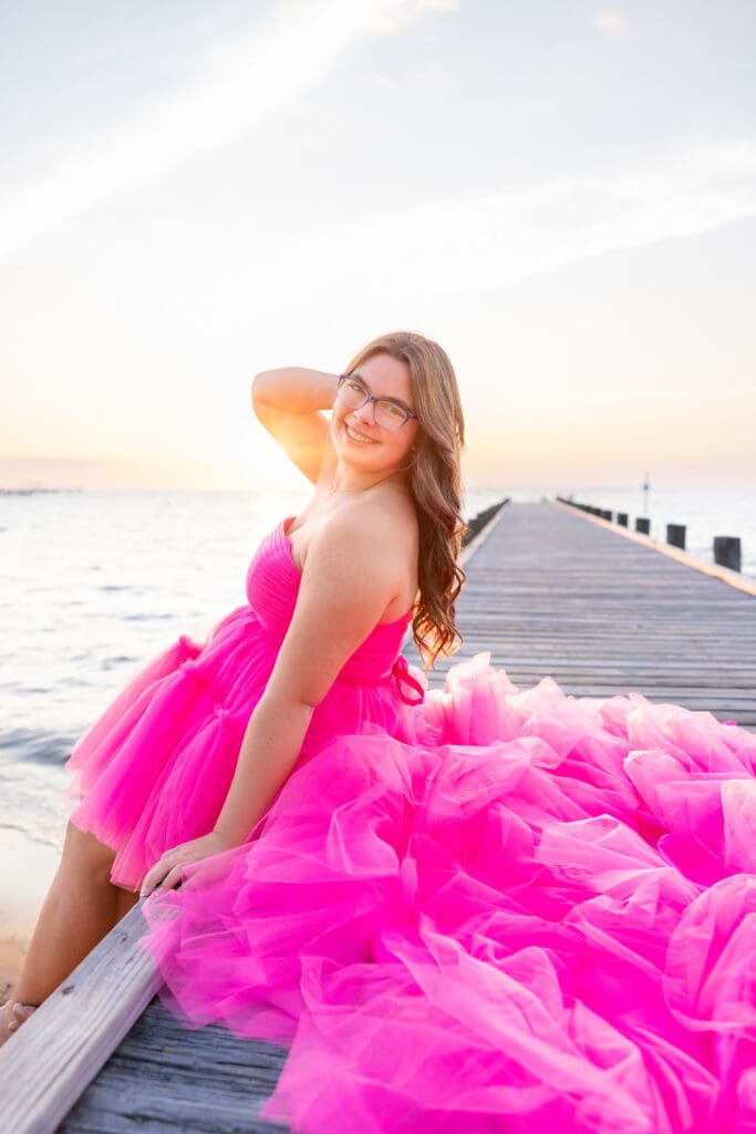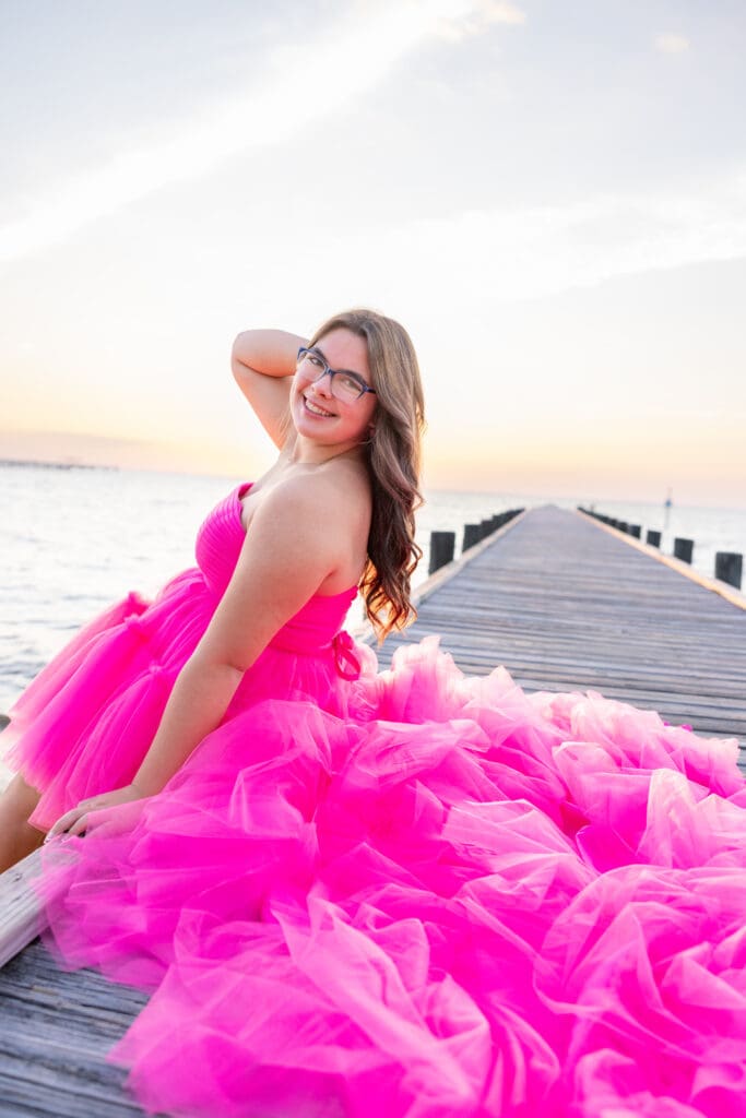 Alyssa wanted her senior photos to capture the essence of her childhood. She wanted to feel young and free again, but also unique. We decided to make her vision come to life at Fairhope Pier. It offers stunning views, especially during sunset. The colors in the sky create a magical backdrop.