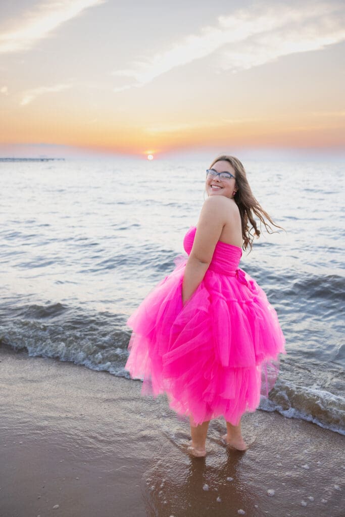 As we moved to the pier, the mood shifted to something more serene. The sun began to set, filling the sky with warm hues. Alyssa posed with the water behind her, and the light created a soft glow. These images perfectly captured her spirit.