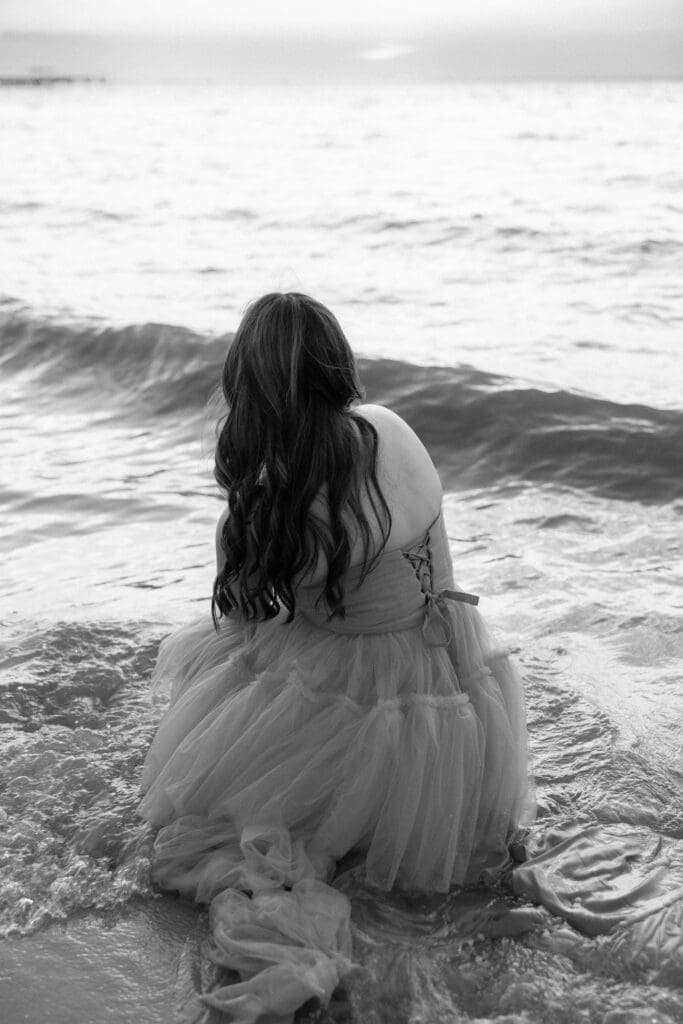 Before heading to the pier, we visited a local flower shop. The shop was full of beautiful light pink and white tones. It felt like stepping into a dream. The soft tones made for lovely photos that showed Alyssa’s playful side. She twirled around, and you could see the joy in her eyes. This was her moment.